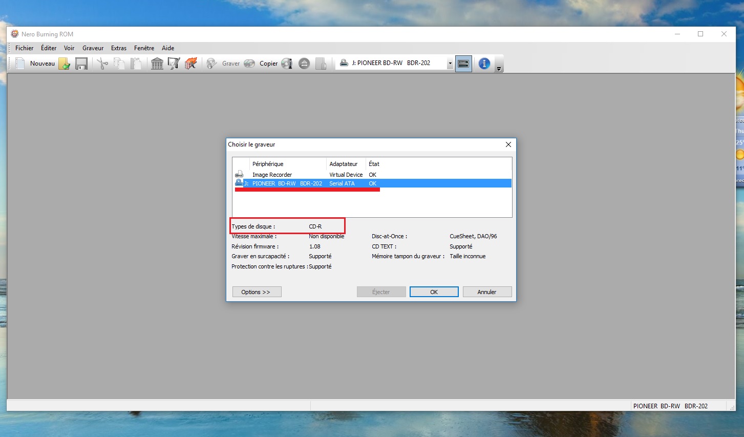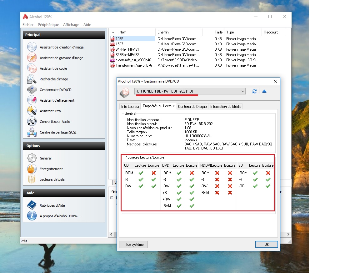 Si Alcohol 120% reconnait bien mon graveur comme un graveur de Blueray/DVD/CD