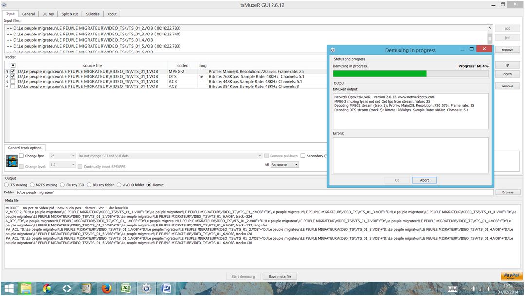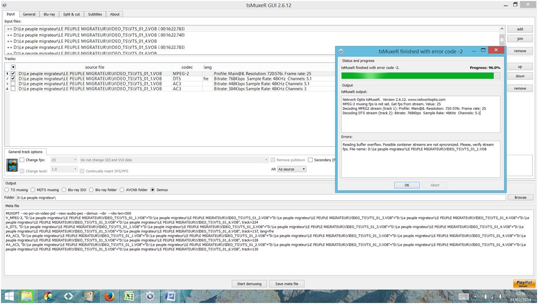 Mais il ya un problème... à 96 % du démuxage, j'ai un massage d'erreur "Reading buffer overflow. Possible container streams are not syncronized. Please, verify stream fps. il name : D:\Le peuple migrateur\LE PEUPLE MIGRATEUR\VIDEO_TS\VTS_01_1.VOB".